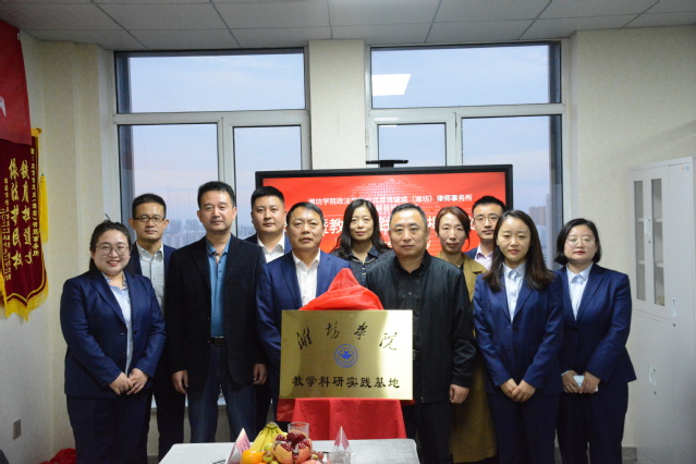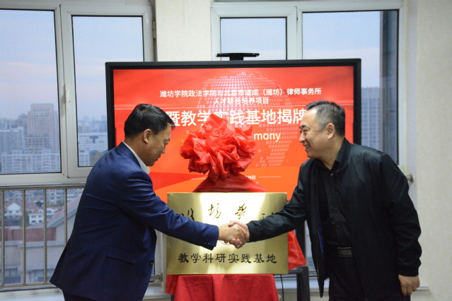 10月26日下午,潍坊学院政法学院与北京市道成(潍坊)律师事务所举行人才联合培养项目签约暨教学实践基地揭牌仪式。政法学院党总支书记曹兴波、副院长杜立聪及院长助理、实训中心主任倪志娟、团总支书记宋薇与北京市道成(潍坊)律师事务所主任王忠超、副主任陈嫣茹及其他合伙人出席签约仪式。