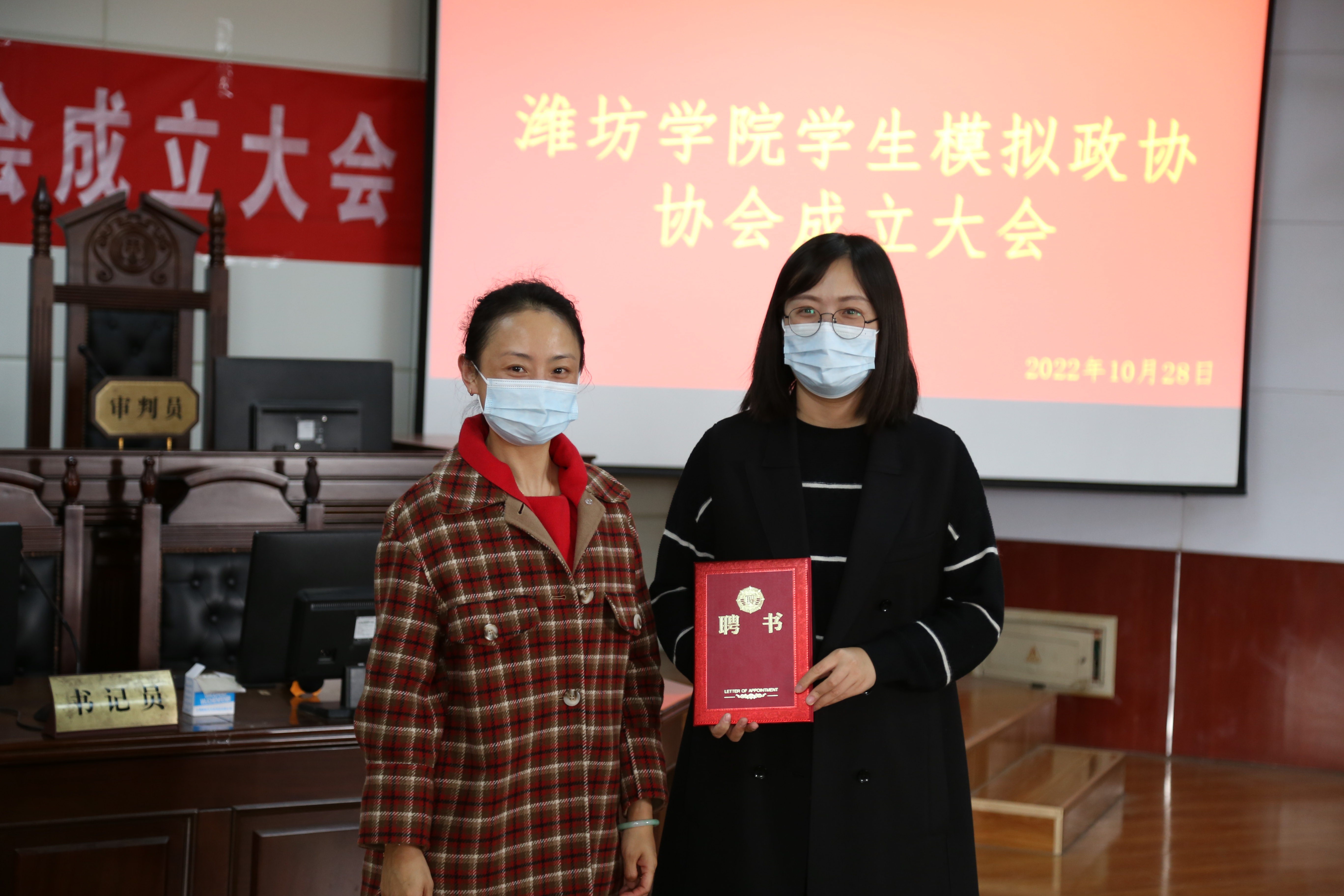 2022年10月28日下午,潍坊学院学生模拟政协协会成立大会在人合楼8321模拟法庭举行。潍坊学院团委社团工作部副部长朱军,政法学院团总支书记宋薇,社团指导老师李小杰出席本次成立大会。