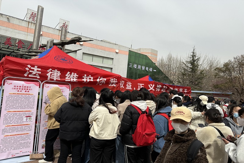 为宣传贯彻新修订的《中华人民共和国妇女权益保障法》和《消费者权益保护法》,3月15日,由学校工会主办、我院承办的“法律维护你我权益,正义撑起弱者蓝天”普法宣传活动在第二餐厅前火热进行,拉开了普法宣传月活动的序幕。