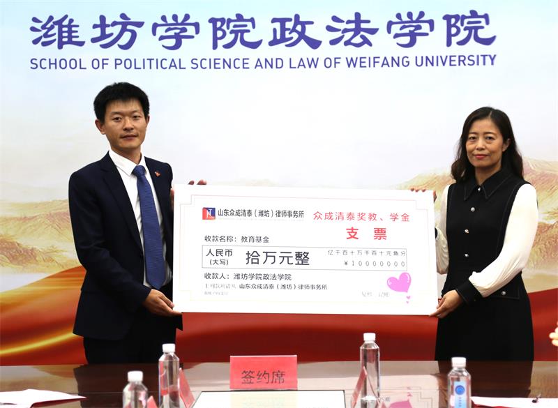 启动仪式上,政法学院副院长杜立聪与众成清泰(潍坊)律师事务所主任陈为涛签订“教学实践基地协议”,党总支书记曹兴波与众成清泰青岛区域副主任周新共同为基地揭牌,同时众成清泰(潍坊)律师事务所向潍坊学院捐赠10万元作为教育基金,助力法学教育教学的发展。