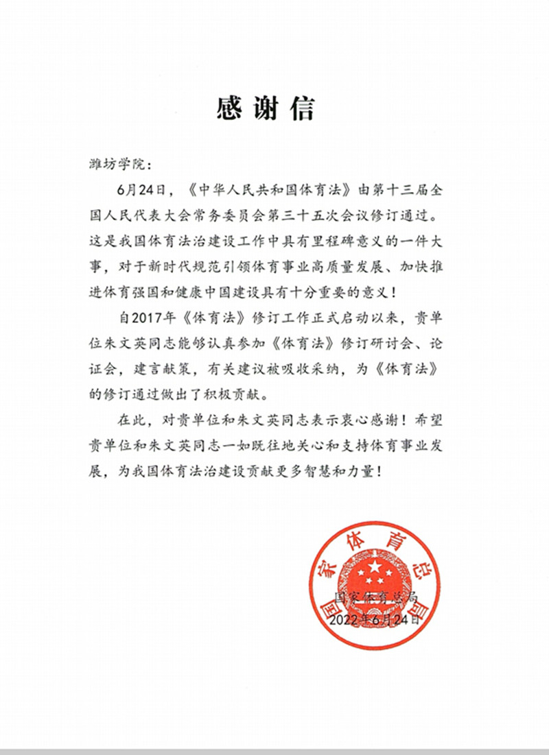 突出教学中心地位,强调重点学科发展。学院始终坚持以教学工作为中心,结合实际情况不断推进教学改革,以教学带科研,以科研促教学,注重优秀科研成果转化,推动学院教学质量稳步提升。积极推动“法律”重点学科建设,对团队成员进行流动管理,以重点学科建设带动整个学院的科学研究工作,推动科学研究方面不断取得新进展。目前,法学专业建设为山东省一流本科专业,并建成11门省级在线课程,获批省级教研立项 2 项,教育部产学合作协同育人项目18项,1个项目获省级教学研究成果二等奖,1个项目获校级教学研究成果二等奖。学院教师充分发挥专业优势,积极参与国家法律法规制定完善相关工作,朱文英教授参与《体育法》修订,获国家体育总局致信感谢。同时,学院提倡“育人为本、德育为先”的理念,一方面加强学风建设,严格落实学校关于课堂教学秩序和考试秩序的规定,形成了良好的学风;另一方面,结合专业加强学生的实践实习教育,提升学生实务能力,理论联系实践,做到知行合一。