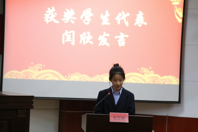 闫欣作为获奖学生代表发言,她讲述了自己“永无止境”的学习态度,对学校和律所表达了诚挚的感谢,并表达了继承这份荣耀和责任的决心。