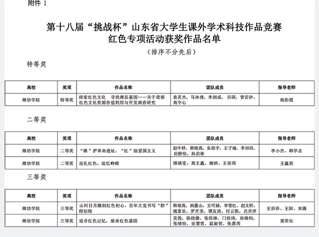 近日,“挑战杯”山东省大学生课外学术科技作品竞赛组织委员会公布《第十八届“挑战杯”山东省大学生课外学术科技作品竞赛红色专项和“黑科技”展示活动获奖作品名单》,我院学生赵中祥等7人作品《“潍”护革命遗址,“红”扬爱国主义》获红色专项二等奖,韩继高等10人作品《山河日月雕刻红色初心,百年大党书写“黔”程似锦》获得红色专项三等奖,实现在本赛事活动中新的突破。