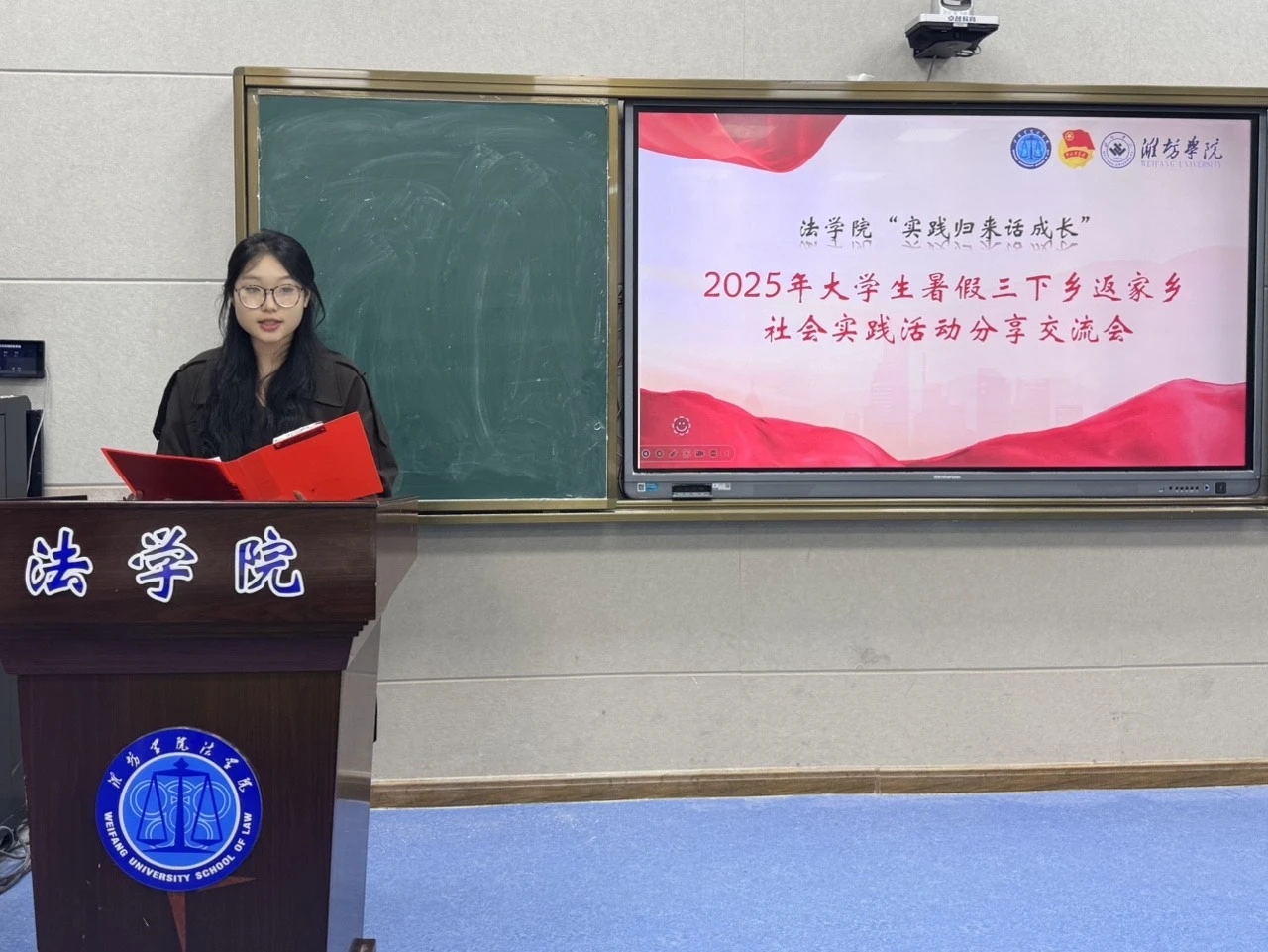 交流会上,5支暑期“三下乡”社会实践活动优秀团队代表依次登台,结合生动案例与实景照片,全方位分享实践成果与深度感悟。“廉润初心・清风鸢起”实践服务队在潍坊开展廉洁文化宣传,让居民知廉洁重要性;尚德志愿服务队开展“模拟法庭进社区”活动,还原案件办理全过程并为社区居民解答法律问题;“丹青铸魂”实践队以“法治文化+红色文化”融合为特色,在参与烈士事迹讲解、陵园环境维护的同时,开展“红色故事里的法治精神”主题宣讲;潍妙潍肖志愿服务队围绕社区环保治理,组织开展垃圾分类宣传等活动,通过制作环保知识手册,引导居民树立环保意识;“绿映黄河・志行天下”志愿服务队深入沿黄多个县区,开展生态法治调研,同步宣传流域保护相关法规条例,为推动沿黄区域生态法治建设注入动能。