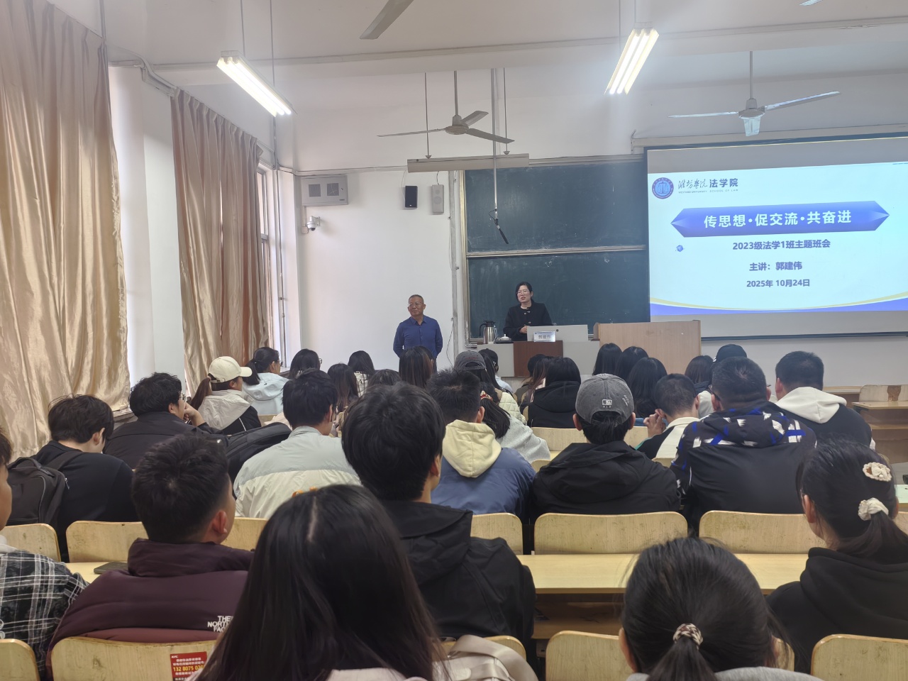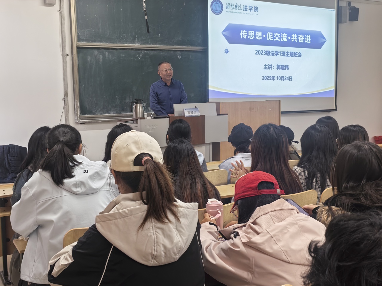 为深入贯彻落实学校领导联系班级制度,搭建领导与青年学子思想交流的桥梁,强化对青年学生的成长引领与价值塑造,10月24日下午,学校正处级统战联络专员郭建伟同志走进我院 2023 级法学 1 班,以“传思想、促交流、共奋进”为主题开展专题班会,围绕“业”之核心,为同学们精准锚定成长坐标。
