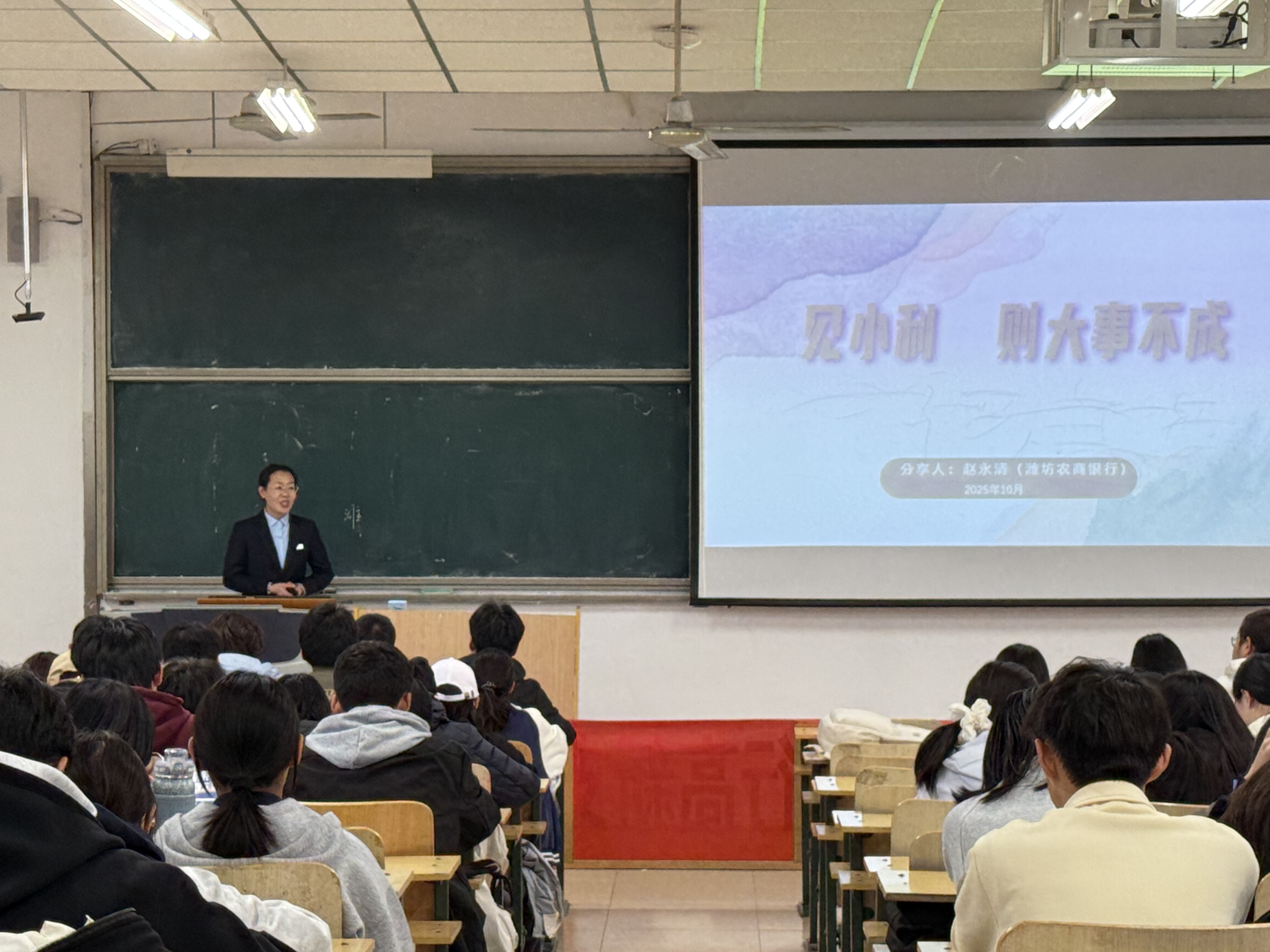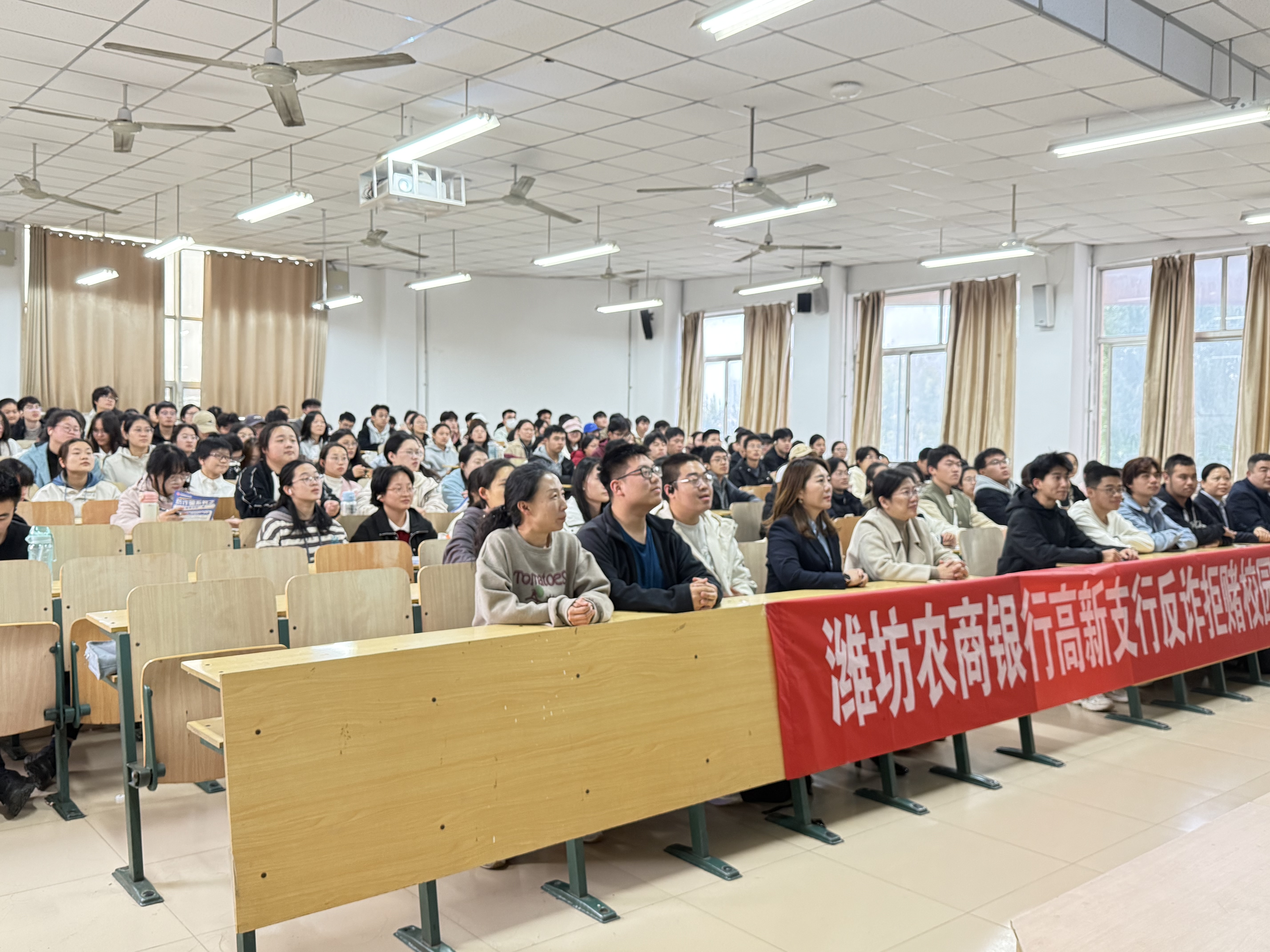 为进一步增强学生金融安全意识,筑牢校园反诈防线,10月28日下午,潍坊农商银行一行来到我院,在8311教室开展金融反诈主题宣讲活动,我院2025级同学参加。