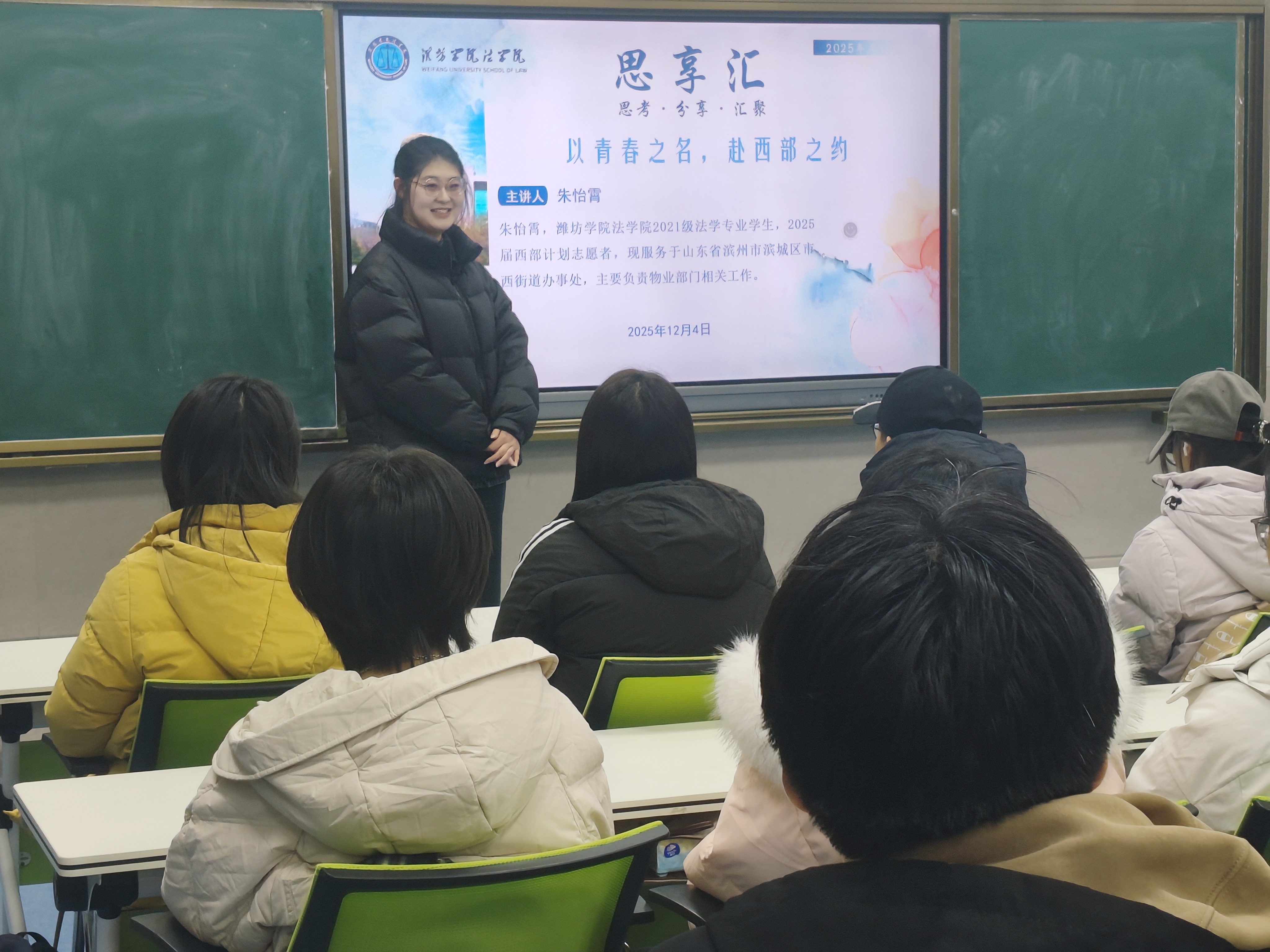 为深化青年学生对大学生志愿服务西部计划的认知,引导广大学子树立“服务基层、奉献西部”的职业理想,12月4日,我院于人合楼8318教室举办以“以青春之名,赴西部之约”为主题的西部计划专题宣讲会。本次活动特邀我院西部计划在岗志愿者朱怡霄返校,结合自身一线服务经历作专题分享,为有意参与西部计划的学生提供了详实的经验参考与清晰的方向指引。