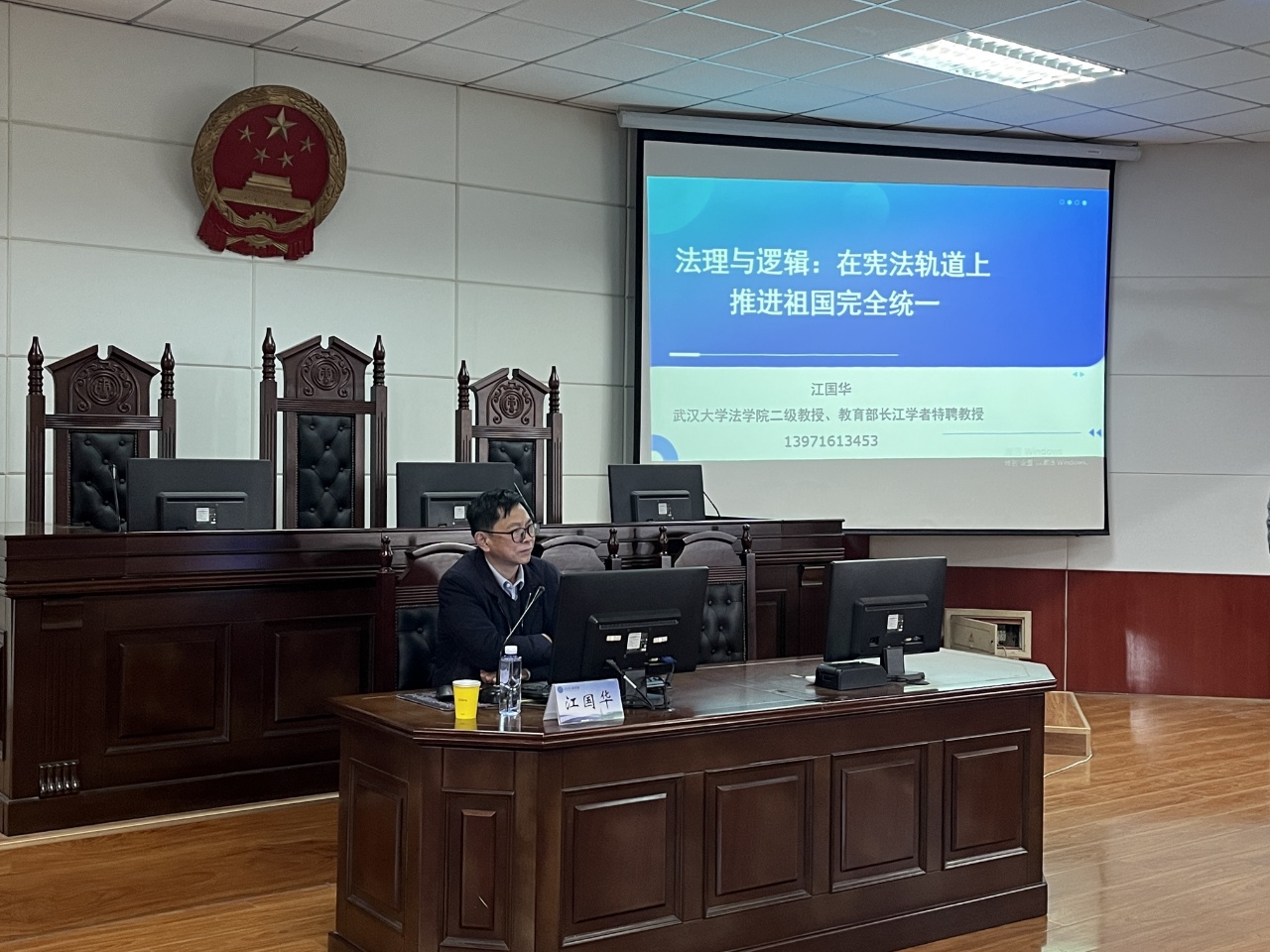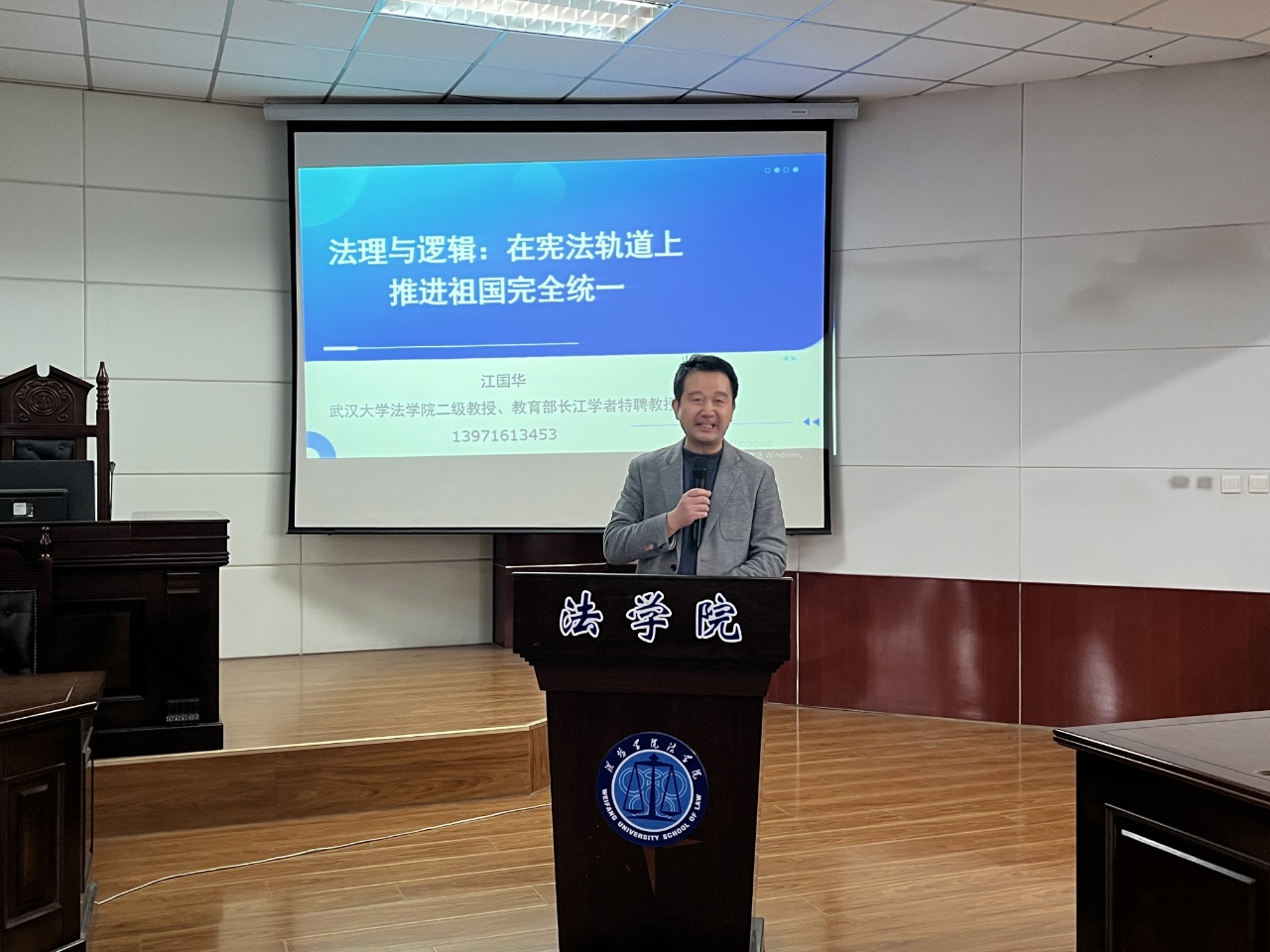 在第十二个国家宪法日来临之际,为弘扬宪法精神、增强统战领域法治意识和国家统一意识,124日,学校统战部与法学院联合举办宪法日专题讲座,特邀武汉大学法学院教授江国华,在人合楼8321教室作题为“法理与逻辑:在宪法轨道上推进祖国完全统一”的专题讲座。讲座由法学院院长杜立聪主持。