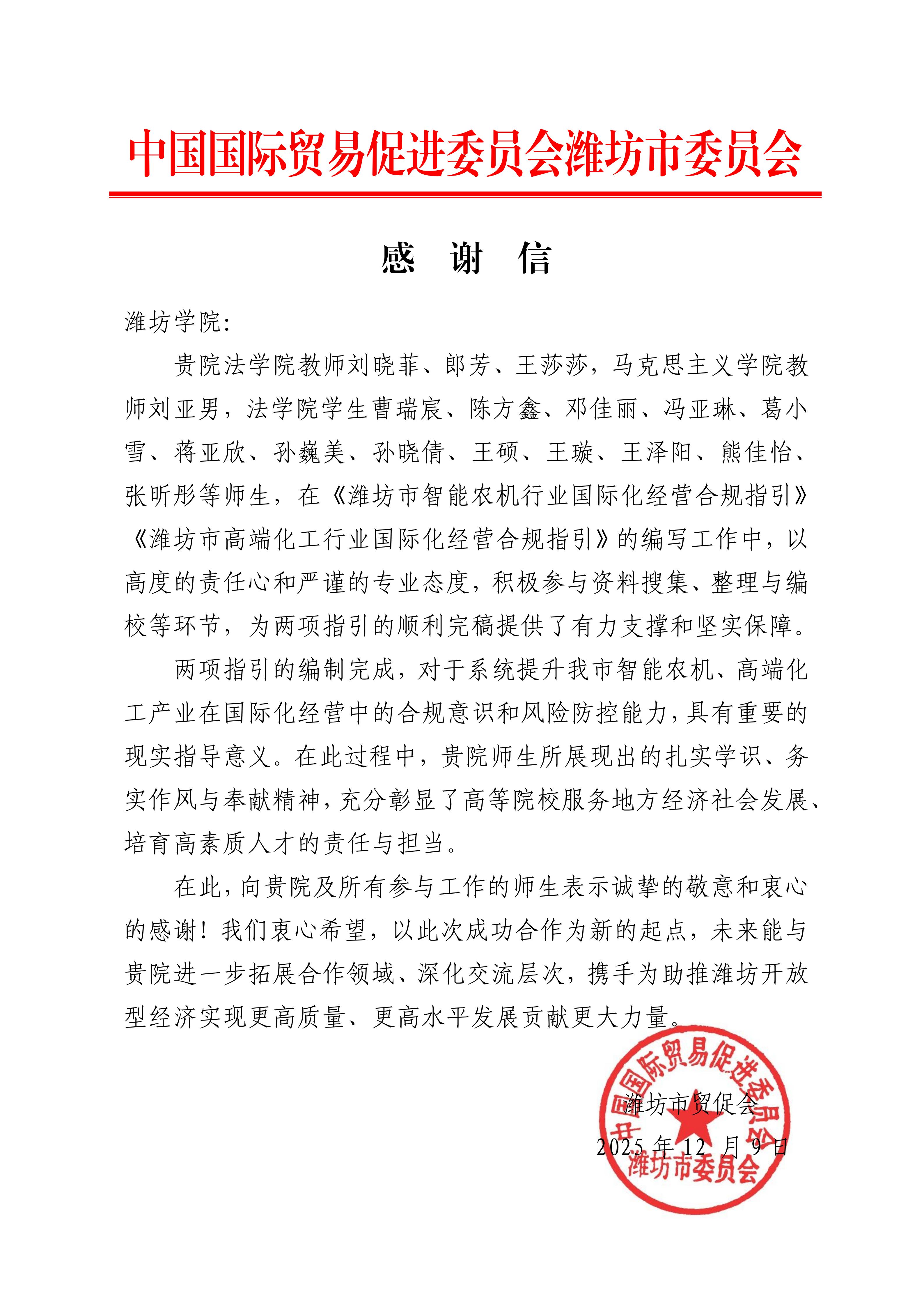 本网讯 近日,中国国际贸易促进委员会潍坊市委员会发来感谢信,向我院师生在《潍坊市智能农机行业国际化经营合规指引》《潍坊市高端化工行业国际化经营合规指引》编制工作中的突出贡献给予高度评价和诚挚感谢。