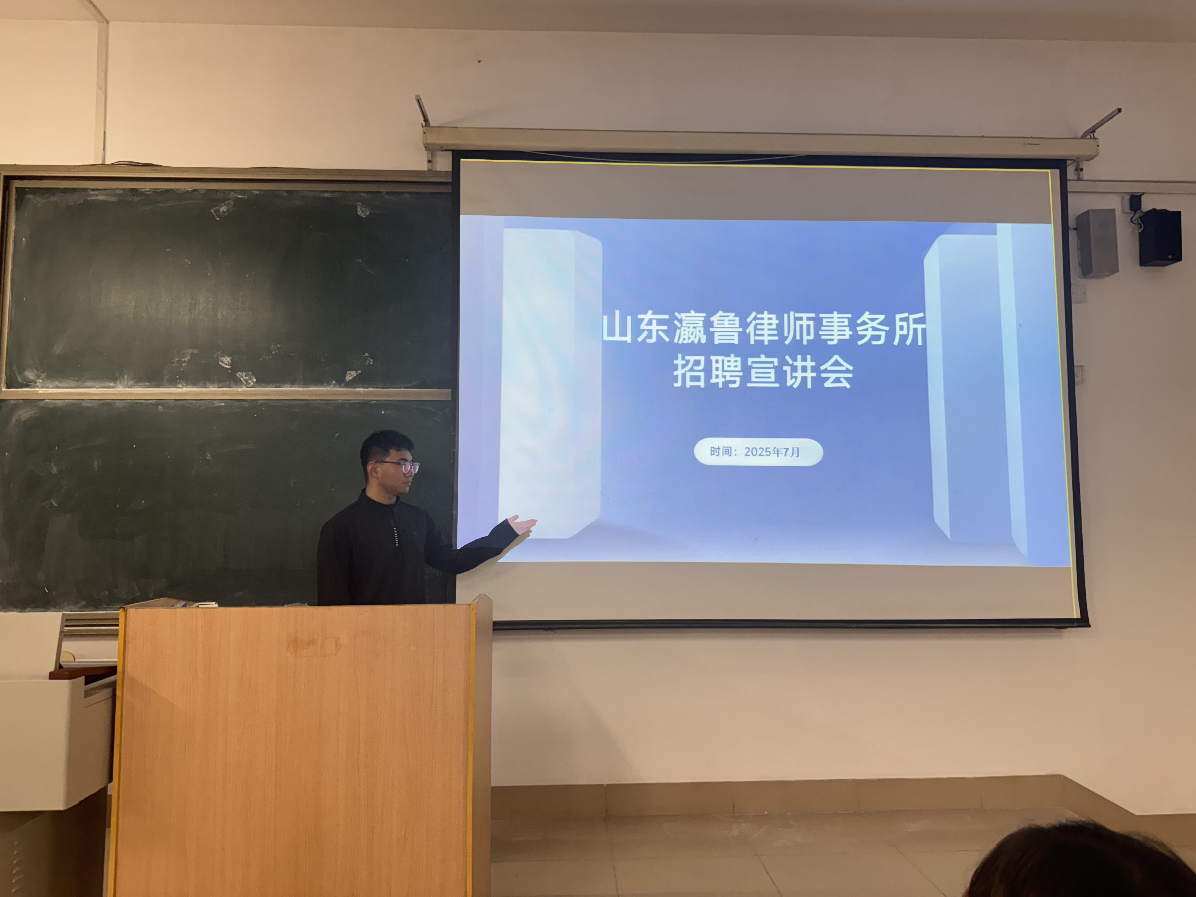 为夯实高质量就业服务平台,搭建校企高效沟通桥梁,助力法律行业优质人才梯队建设,2025年7月,我院于人合楼8326室举办山东瀛鲁律师事务所招聘宣讲会。山东瀛鲁律师事务所资深执业律师亲临现场招贤纳士,我院相关专业学生踊跃参与,现场交流氛围热烈浓厚。