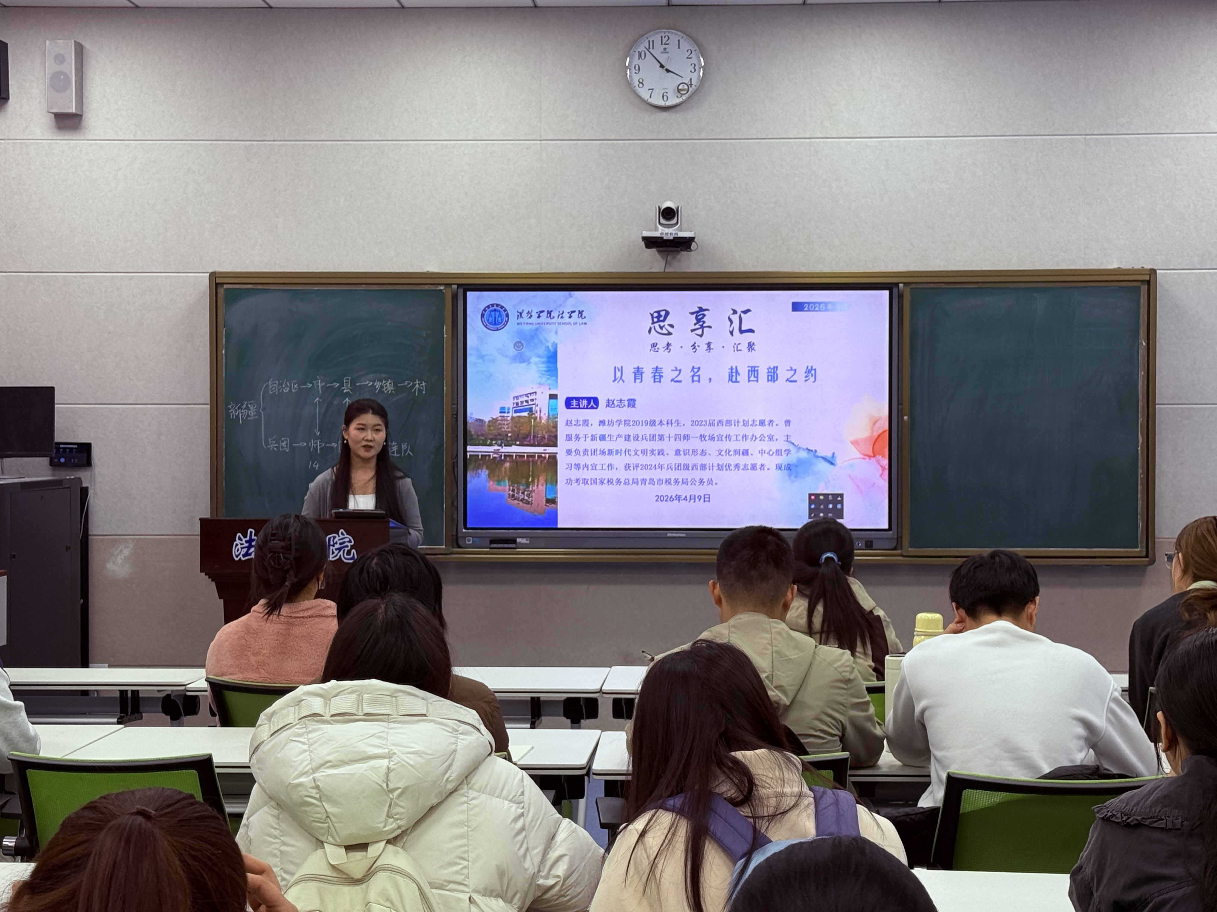 为深入推进思想政治教育与就业指导工作深度融合,引导广大青年学子树立扎根基层、奉献社会的理想信念,4月9日下午,我院于人合楼8318教室成功举办大学生志愿服务西部计划宣讲会。本次活动特邀2023届优秀校友、西部计划志愿者赵志霞主讲,我院2026届毕业生到场参会。